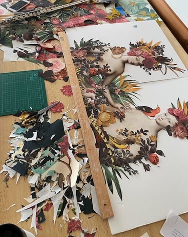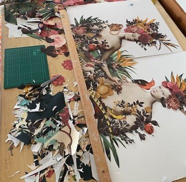 I make collages, draw and paint. In my collages I use a variety of papers of different sources, different textures, making each collage very unique.".